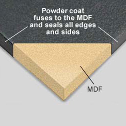 We have perfected a process of applying powder coating on MDF (medium density fiberboard) creating a finish that is as durable as metal, is less expensive and is perfect for home use. As a matter of fact, our unique process has been patented!